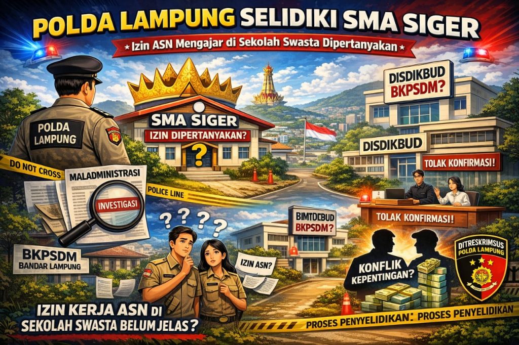 MATA VIVO- Penugasan aparatur sipil negara (ASN) dan pegawai negeri sipil (PNS) sebagai tenaga pendidik di SMA Swasta Siger, Kota Bandar Lampung, kini menjadi sorotan serius. Selain izin operasional sekolah yang belum dipublikasikan secara terbuka, kebijakan penempatan ASN tersebut juga telah masuk tahap penyelidikan Ditreskrimsus Polda Lampung, memicu pertanyaan soal kepatuhan administrasi, potensi maladministrasi, hingga konflik kepentingan di lingkungan pemerintah daerah.